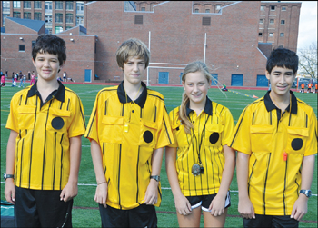 Charlestown Soccer referees in-training Liam Kennedy, Danny Murray, Sophie Shea and Alek Estrada. The young refs are training to officiate at soccer matches and will pursue official Massachusetts licensure over the Fall. This will give them the chance to refereeat some of the over 30,000 soccer matches that are played each year in Massachusetts.
