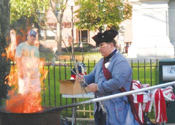 Members of the American Legion James Conway Post 26 held their annual flag retirement ceremony last Thursday. Shown in the above photo Charlestown Militia Captain Tom Coots get rteady to dispose of a flag. Flag burning is the proper way to dispose of older flags that are no longer used for public display. Shown in the photograph to the left are, from left to right: Boston Police Sargent Tom Lema, Eileen Locke, Commander of Post 26, Billy Boyle and Boston Fire Department Chaplain Father Dan Mahoney.